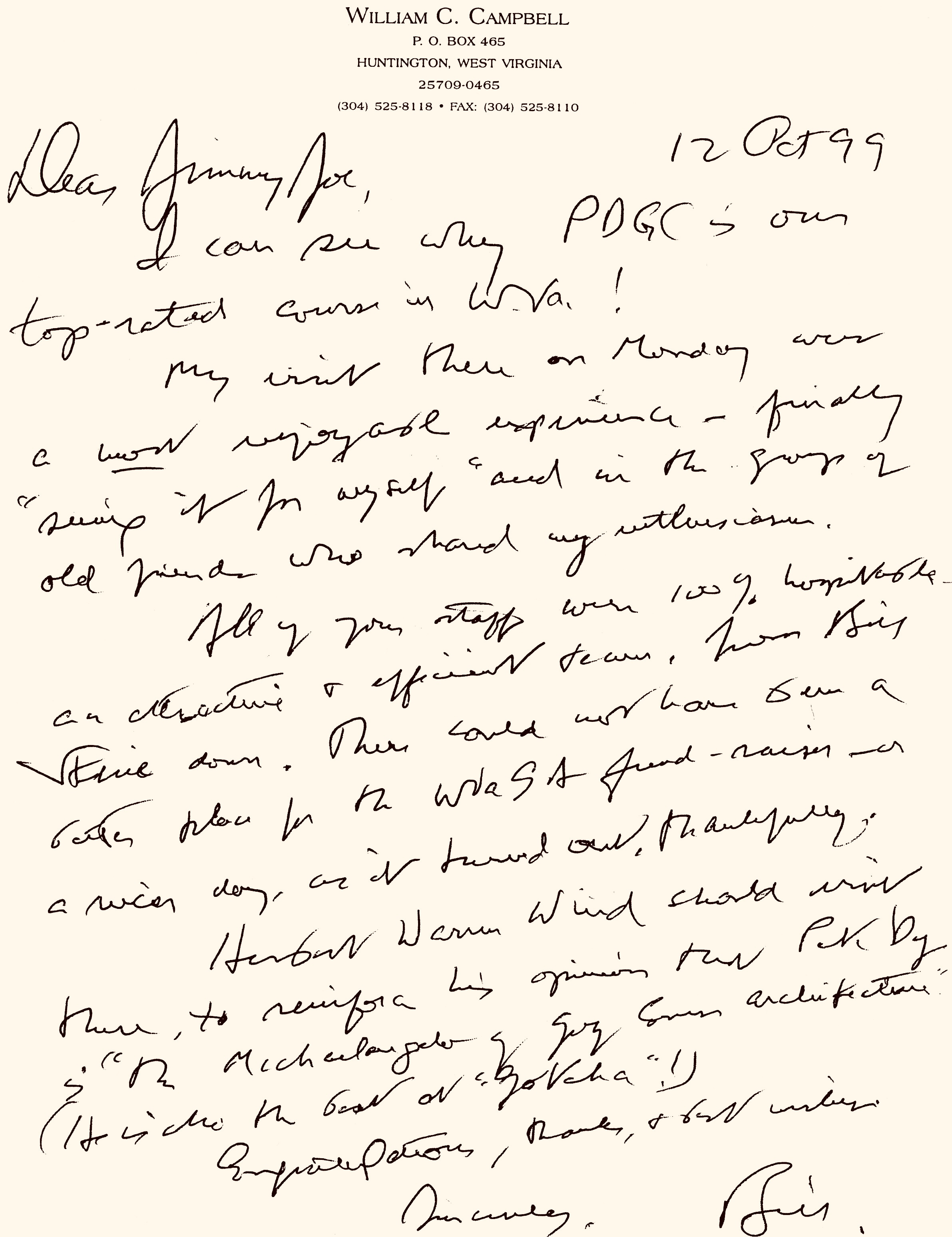 Bill Campbell—a Huntington, West Virginia native and one of the most revered amateur golfers in the world—was our honoree. He told a story that has stayed with me ever since. Years earlier, during the British Amateur, his close friend and tour professional Henry Cotton died unexpectedly. Mr. Campbell was asked to deliver the eulogy, and after the tournament traveled to London, where he stood in Westminster Abbey and spoke before the Queen of England.